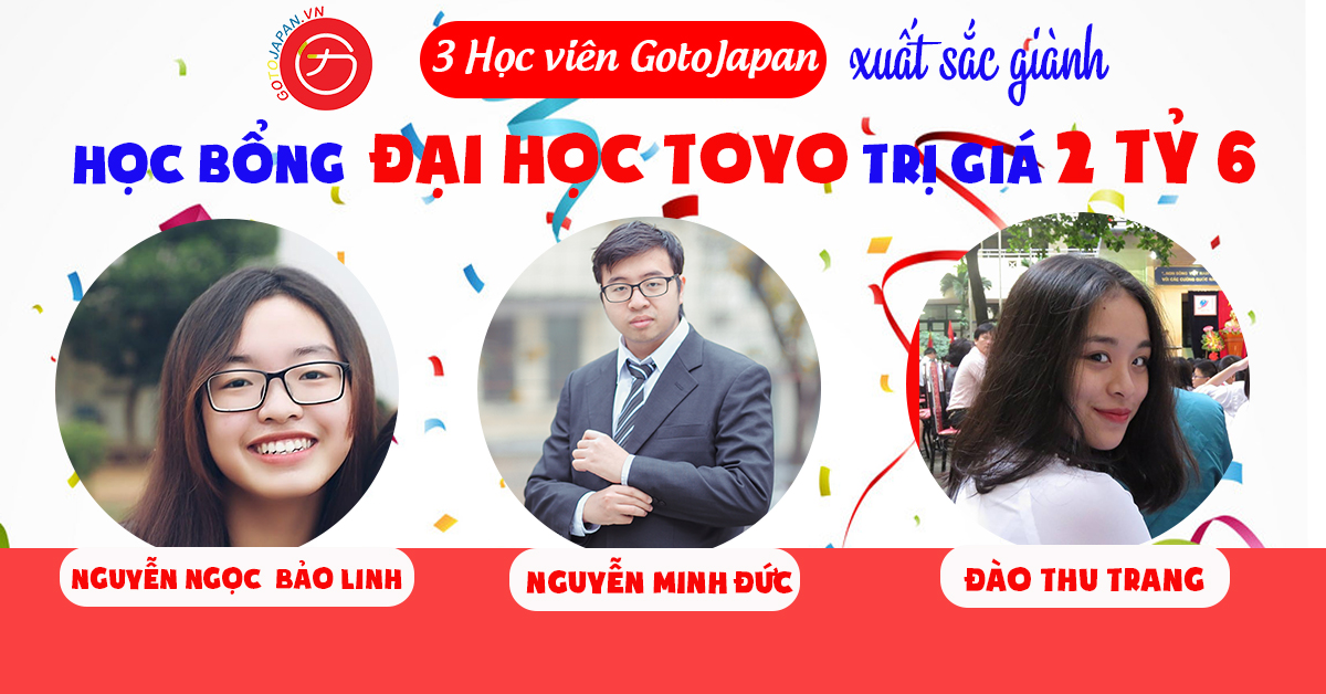 Tiếp nối sự thành công trong sứ mệnh hỗ trợ apply học bổng du học Nhật, ngày 07/05/2019, GoToJapan tiếp tục nhận được tin mừng khi 03 bạn học viên của GOTOJAPAN đã vượt qua các học viên xuất sắc khác để giành được học bổng Đại học TOYO có trị giá khủng lên đến 1 tỷ 4. Đây quả thật là một niềm tự hào lớn đối với GoToJapan: