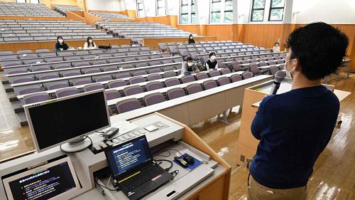 Một lớp học nửa online - nửa offline tại ĐH Doshisha do sinh viên quốc tế không thể nhập cảnh vì lệnh cấm của Chính phủ Nhật Bản (Ảnh: Nikkei).