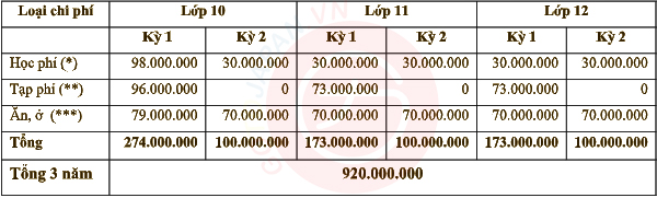 (**): bao gồm bảo hiểm, tiền sách vở, cặp sách, đồng phục, giày và quần áo thể dục, phí dã