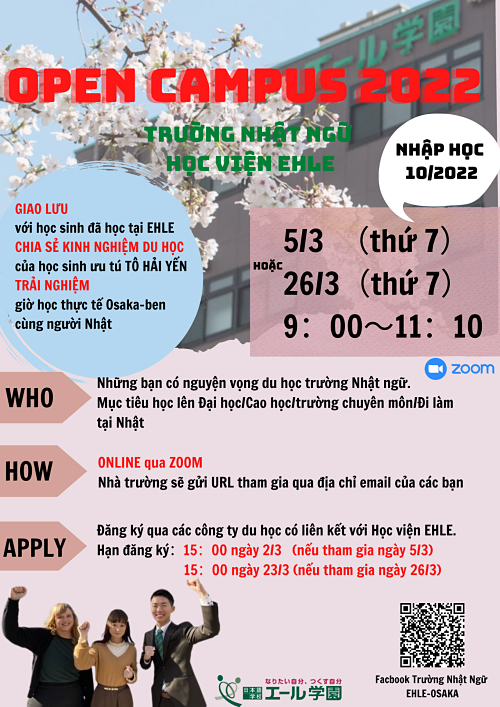 Tin hot đây các bạn ơi! Ngày 5/3 và 26/3 tới, Học viện EHLE sẽ tổ chức buổi Open Campus cho các bạn có nguyện vọng sang du học/làm việc tại Nhật Bản!