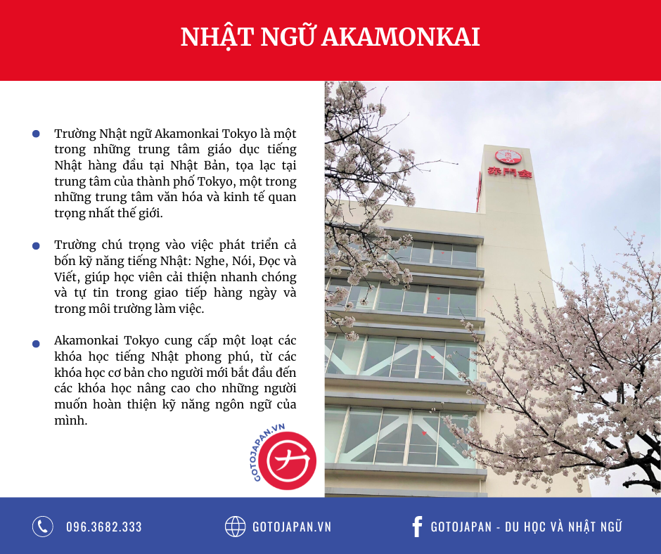 Trường Nhật ngữ Akamonkai Tokyo, với hơn 30 năm lịch sử và uy tín trong lĩnh vực giáo dục tiếng Nhật, là một trong những cơ sở đào tạo hàng đầu tại thủ đô Tokyo, Nhật Bản. Với mục tiêu cung cấp cho sinh viên một môi trường học tập và trải nghiệm văn hóa tốt nhất, Akamonkai Tokyo không chỉ là nơi học tiếng Nhật mà còn là cầu nối giữa sinh viên quốc tế và văn hóa Nhật Bản.