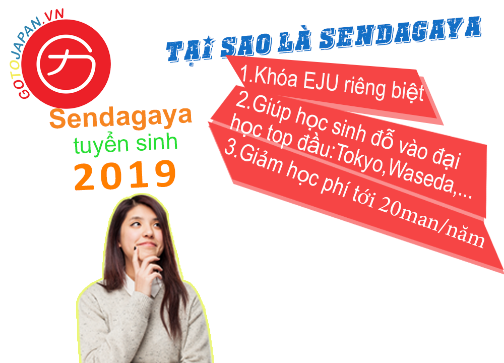 Hiện nay, học viện ngoại ngữ Sendagaya cùng GoToJapan đang tiến hành tuyển sinh những học sinh xuất sắc nhất từ tại Việt Nam để trao Học bổng lãnh đạo châu Á. Dựa vào những thành tựu và kinh nghiệm của GoToJapan, trường Nhật ngữ Sendagaya tin tưởng lựa chọn GoToJapan làm đại diện tuyển sinh chính thức cho học bổng này. Đã có rất nhiều học sinh được GoToJapan hỗ trợ thành công đỗ vào trường Nhật ngữ sendagaya, và con số này chắc chắn sẽ còn nhiều hơn nữa trong năm 2019.