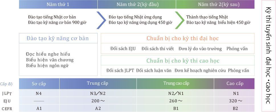 Nhiều trường dạy tiếng Nhật chỉ cung cấp các lớp học vào buổi sáng hoặc buổi chiều, nhưng trường thì áp dụng việc dạy cả sáng và cả chiều. Vào buổi sáng, học năng lực tiếng Nhật cơ bản, buổi luyện thi cho kỳ thi đại học tiếng Nhật Bản, kỳ thi năng lực tiếng Nhật, để có thể chuẩn bị sẵn sàng cho kỳ thi đại học tiếng Nhật.