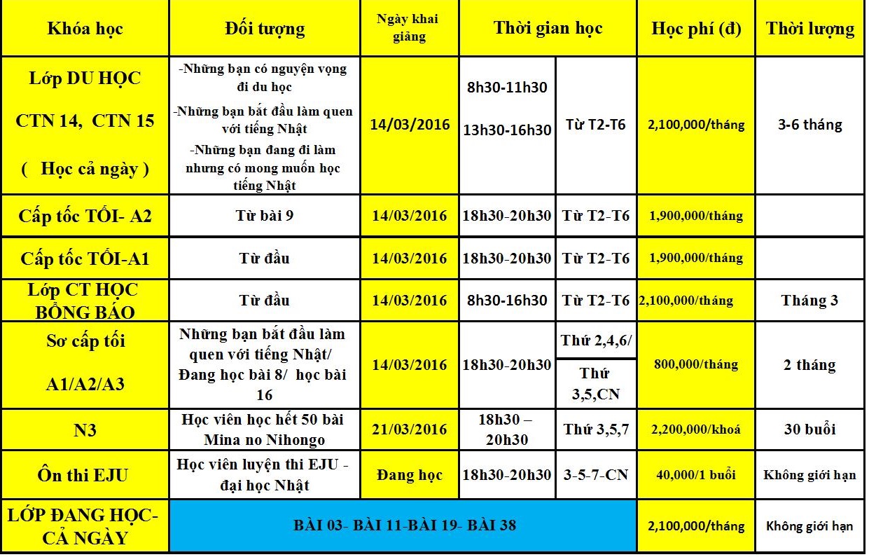 Trung tâm GotoJapan cập nhật lịch khai giảng các lớp tiếng Nhật trong tháng 3-2016 như sau: