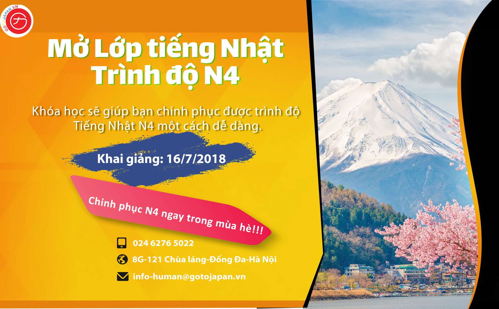 Ngay giữa tháng 7 (16/7/2018) sôi động của mùa hè, GoToJapan sẽ mở lớp tiếng Nhật trình độ N4-khóa học được thiết kế đặc biệt mà chỉ có tại GoToJapan để giúp các bạn tiếp thu và chinh phục N4 tiếng Nhật một cách dễ dàng. Khóa học không chỉ cung cấp những mẫu ngữ pháp, từ vựng trình độ N4 như nhiều khóa học ở những nơi khác mà học sinh tham gia khóa học này của GoToJapan cũng sẽ được nâng cao kỹ năng đọc hiểu, nghe hiểu và thực hành những kỹ năng giao tiếp nâng cao. Trong quá trình học các bạn sẽ được giáo viên theo dõi sát sao để có thể bám sát được chương trình giảng dạy.