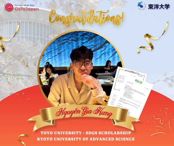 Hành trình apply lần hai được chuẩn bị kỹ lưỡng hơn rất nhiều: từ việc chỉn chu từng bài luận cá nhân, luyện phỏng vấn bài bản, đến việc trau dồi kiến thức học thuật và hiểu biết về ngành học. Và rồi, sự bền bỉ ấy đã được đền đáp xứng đáng: Gia Hưng chính thức đỗ Toyo University kỳ tháng 10/2025, và hơn thế nữa, em xuất sắc giành được International Students SDGs Ambassador Scholarship – học bổng danh giá dành cho sinh viên quốc tế.
