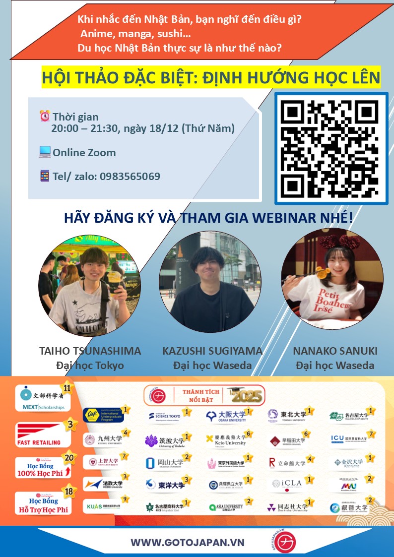 Nhằm mang đến những góc nhìn thực tế, khách quan và có chiều sâu, GotoJapan – Trung tâm du học Nhật Bản tổ chức Hội thảo trực tuyến “Định hướng học lên cùng anh chị người Nhật ưu tú”, giúp học sinh, sinh viên và phụ huynh có thêm cơ sở để đưa ra quyết định học tập đúng đắn cho năm 2025 và các năm tiếp theo.