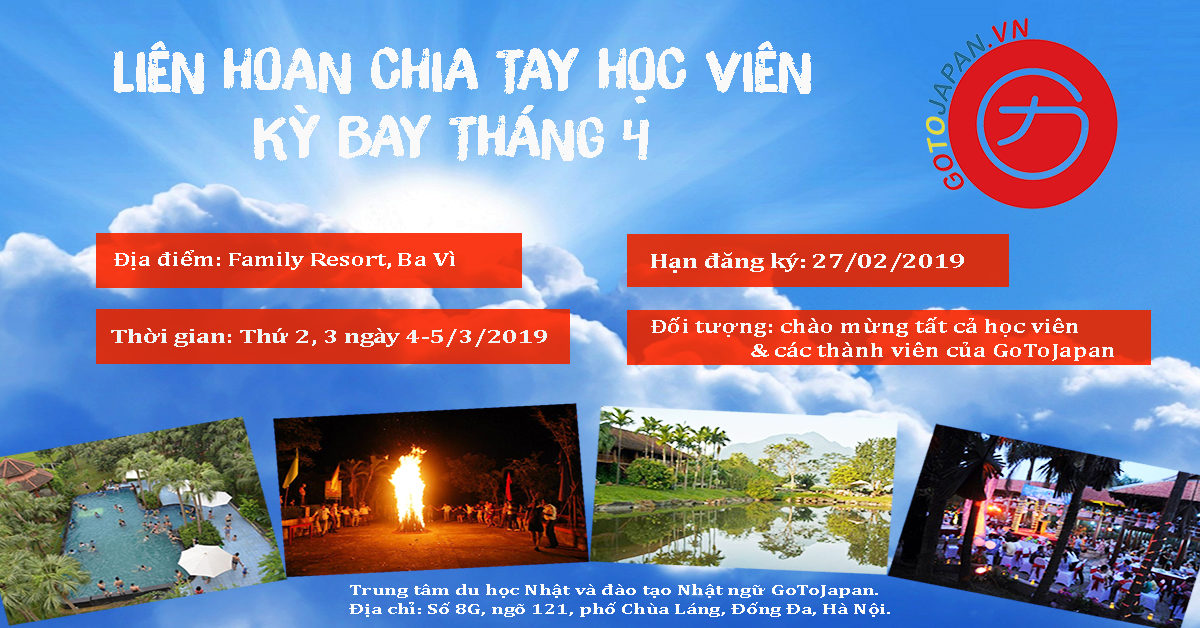 Trong đợt chia tay các bạn học viên kỳ bay tháng 4, năm 2019 này, GoToJapan xin mời tất cả các bạn dù là trai hay gái, trẻ hay già, là học viên sắp bay hay chưa bay, đang học tại GoToJapan, sắp học hay đang có ý định đăng ký tại GoToJapan hãy cùng tham gia chương trình.