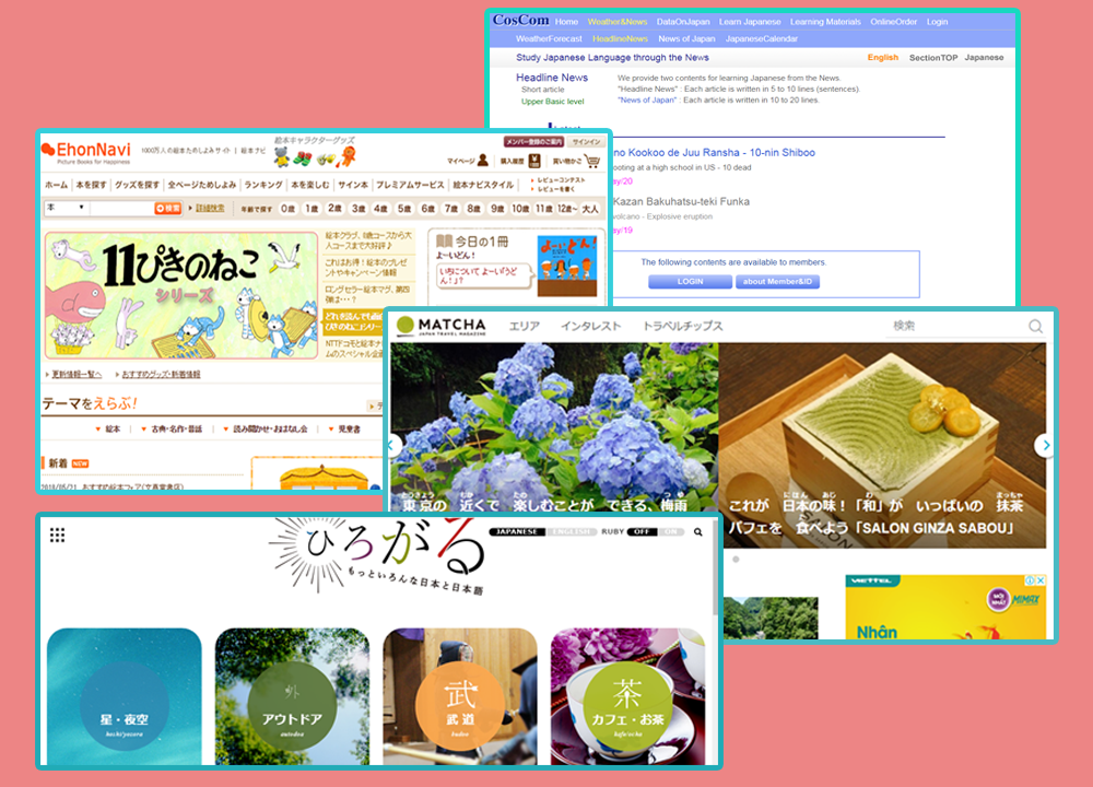 -Matcha: Nội dung của matcha là về du lịch và văn hóa, Trang này 8 ngôn ngữ khác nhau trong đó có cả tiếng Việt. Matcha có sử dụng kanji trong bài nhưng luôn kèm furigana ở trên.