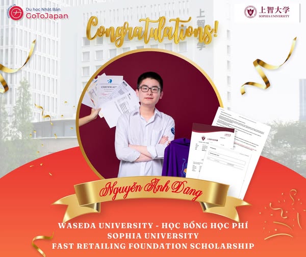 Sau 7 lần apply, 3 lần chờ kết quả, cuối cùng, Dũng đã nhận được 2 lá thư báo đỗ – từ Waseda University và Sophia University. Cùng với đó là 2 học bổng danh giá – trong đó có học bổng toàn phần từ Fast Retailing Foundation, và một suất học bổng trị giá 1.000.000 JPY từ Waseda University – như một phần thưởng xứng đáng cho sự kiên trì và bản lĩnh không lời của em.