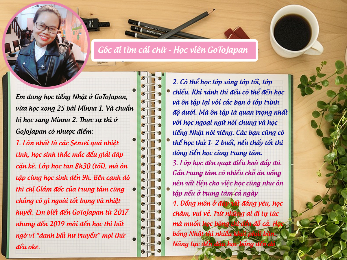 “Em đang học tiếng Nhật ở GoToJapan, vừa học xong 25 bài Minna 1. Và chuẩn bị học sang Minna 2. Thực sự thì ở GoJoJapan có nhược điểm: