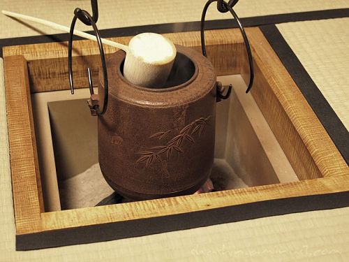 – Ro (炉) – lò đun nước cố định: Ro thường được sử dụng vào mùa thu – đông do đun sôi nước nhanh hơn và giữ nước ấm lâu hơn. Do Ro được làm âm dưới sàn, chiếu tatami trải trên sàn sẽ được khoét lỗ phù hợp để dễ dàng đặt ấm, thay than và dọn tro.