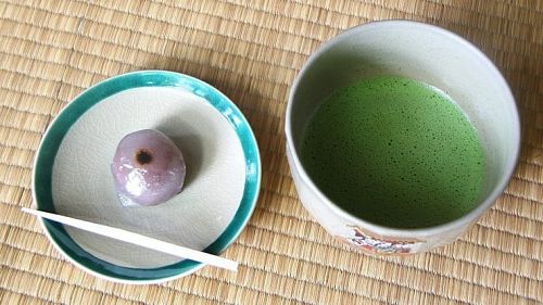Miếng bánh wagashi và chén trà. (Ảnh: www.japan-guide.com)
