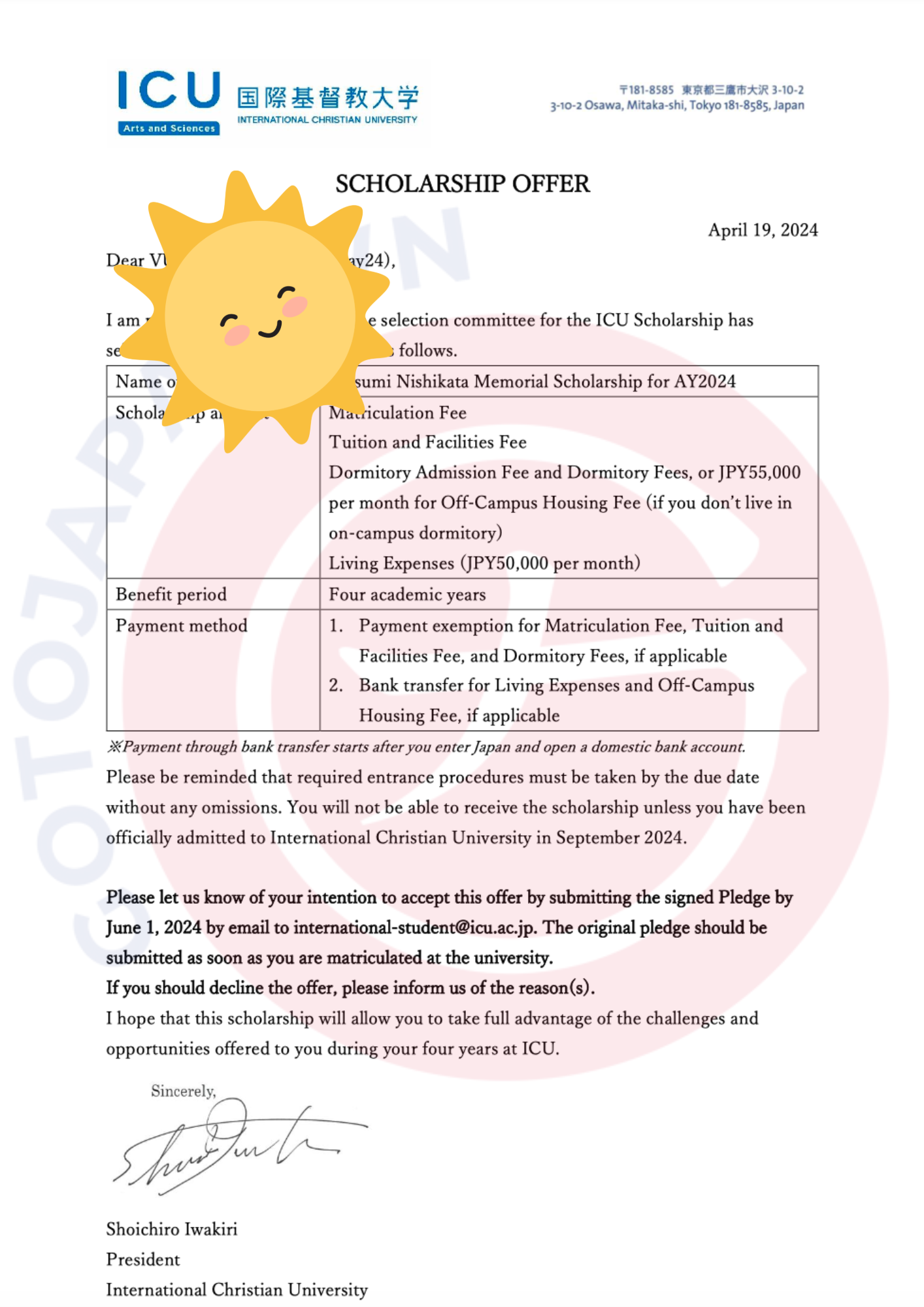 Và thành công không dừng lại ở đó. Không chỉ giành được học bổng toàn phần Masumi Nishikata Memorial, Thu Minh còn nhận được một lời mời đầy hứa hẹn từ một trường Đại học hàng đầu (TOP #5) khác tại Nhật Bản. Học bổng Mentor Mitakai Scholarship có giá trị là 100% học phí trong 4 năm, không chỉ là một phần thưởng về thành công của Thu Minh, mà còn là một sự công nhận về tài năng và tiềm năng của cô.